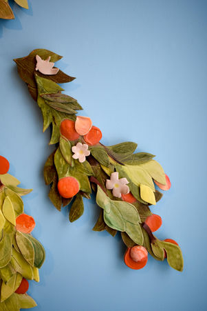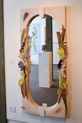 Ceramic garlands adorn this mirror tiled with Plainsman H441G- a black Cone10 clay of Albertan Feldspar that fires beige and blushes in a high-fire kiln. Plainsman clay has been mining clay in Alberta since 1962.